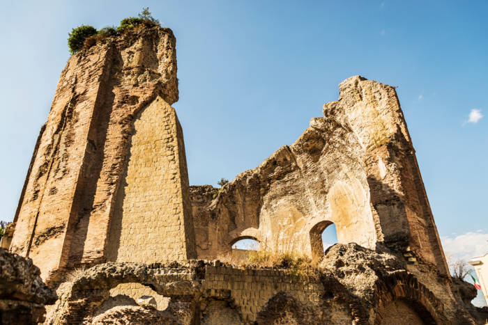 Aerial view of the temple of Venus located in the archaeological park of Baia, a hamlet of Bacoli, in the metropolitan city of Naples, in Campania, Italy. It was an octagonal thermal building, with umbrella type dome. (Stefano Tammaro/Adobe Stock)