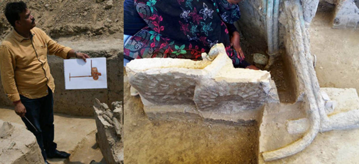 Top image: Chariot exposing the wheels and copper pillar. Source: Archaeological Survey of India/Radiocarbon