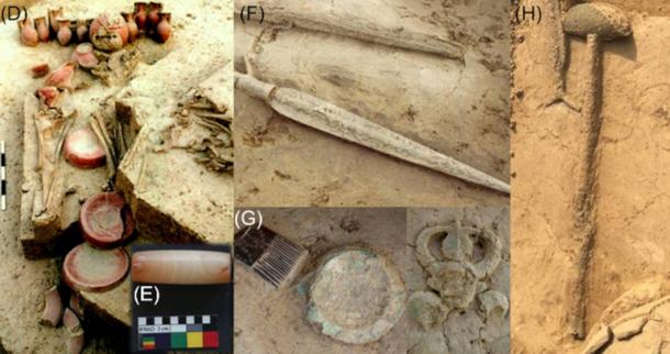 Variety of pots and bones from the burials. (E) Cylindrical bead. (F) Sword (G) Wooden comb. (H). Torch (Mashaal). (Sharma, S et al. 2024/Archaeological Survey of India/Radiocarbon)
