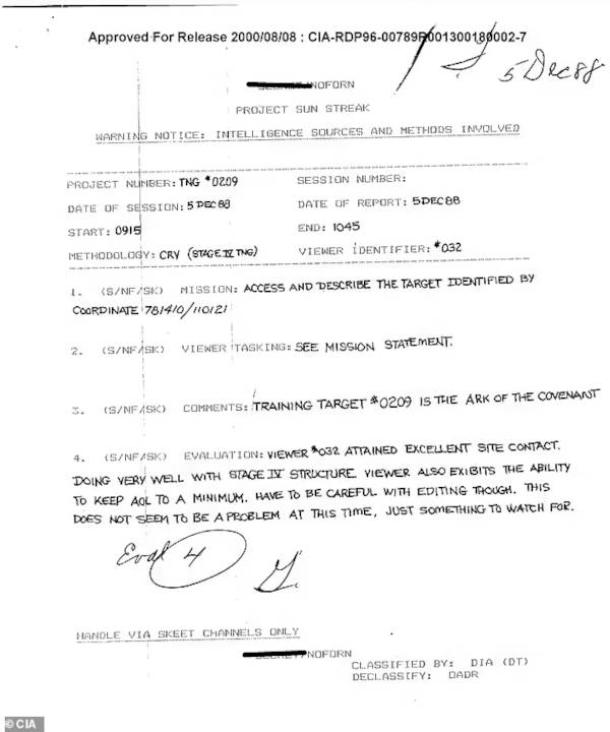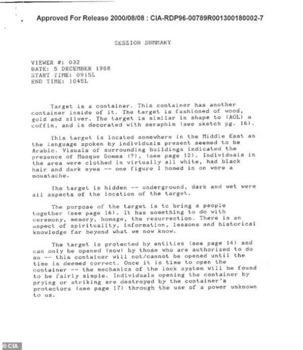 The CIA document describes a training exercise that took place on December 5, 1988. During the session, a remote viewer projected their consciousness beyond their physical self in an effort to locate the Ark of the Covenant, recording their perceptions along the way. "What he wrote was bone-chilling," Hooper commented.