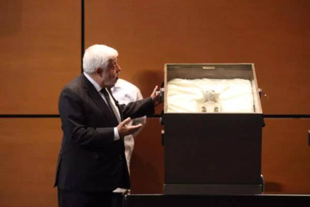 Ufologist and journalist Jaime Maussan presenting an “alien mummy” to the Mexican Congress. (Cámara de Diputados ).