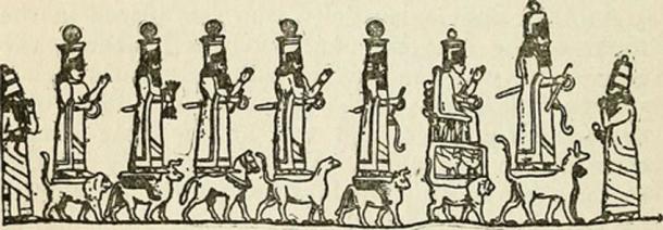 Star-worshippers flanking Ashur, Ishtar, Sin, Enlil, Shamash, Adad, and Ishtar of Arbela. (The Commons)