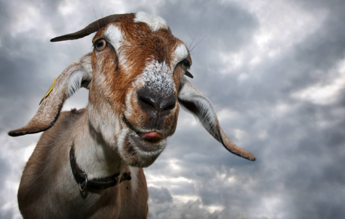 Top image: Goat’s face with tongue out, ready to torture! Source: Linas T/Adobe Stock