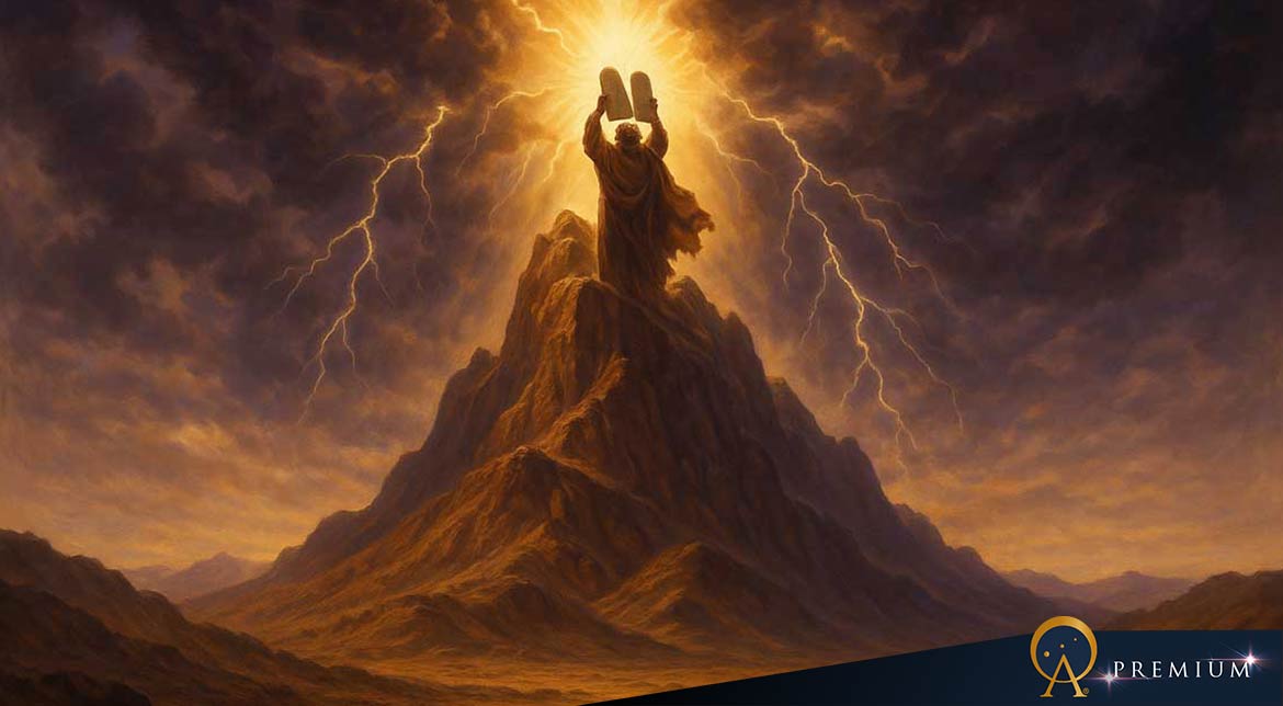 Top Image: A dramatic biblical scene of Mount Sinai with Moses receiving the Ten Commandments. (GPT)