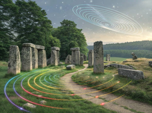 Representation of subatomic waves at an imaginary megalithic site. (AI Generated)
