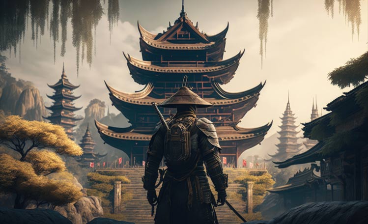 Top image: Samurai and oriental temple in the background, samurai with armor, Generative AI