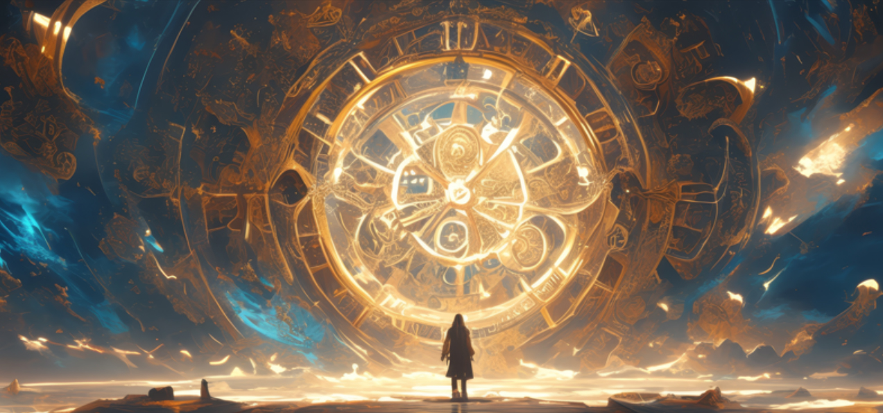 Top image: A glowing ancient cosmic clock with the zodiac signs on its face stands in an otherworldly landscape, surrounded by ethereal figures and celestial bodies, creating a sense of wonder and mystery. Source: Photo And Art Panda/Adobe Stock