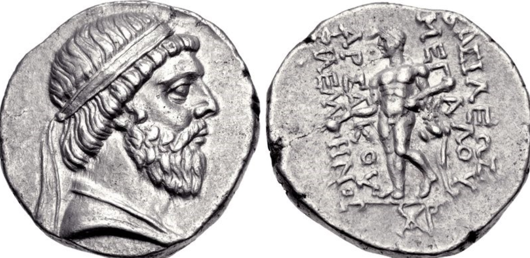 Top image: Drachma of Mithridates I, showing him wearing a beard and a royal diadem on his head. Reverse side: Heracles/Verethragna, holding a club in his left hand and a cup in his right hand. Source: Classical Numismatic Group, Inc. http://www.cngcoins.com/ CC BY-SA 3.0