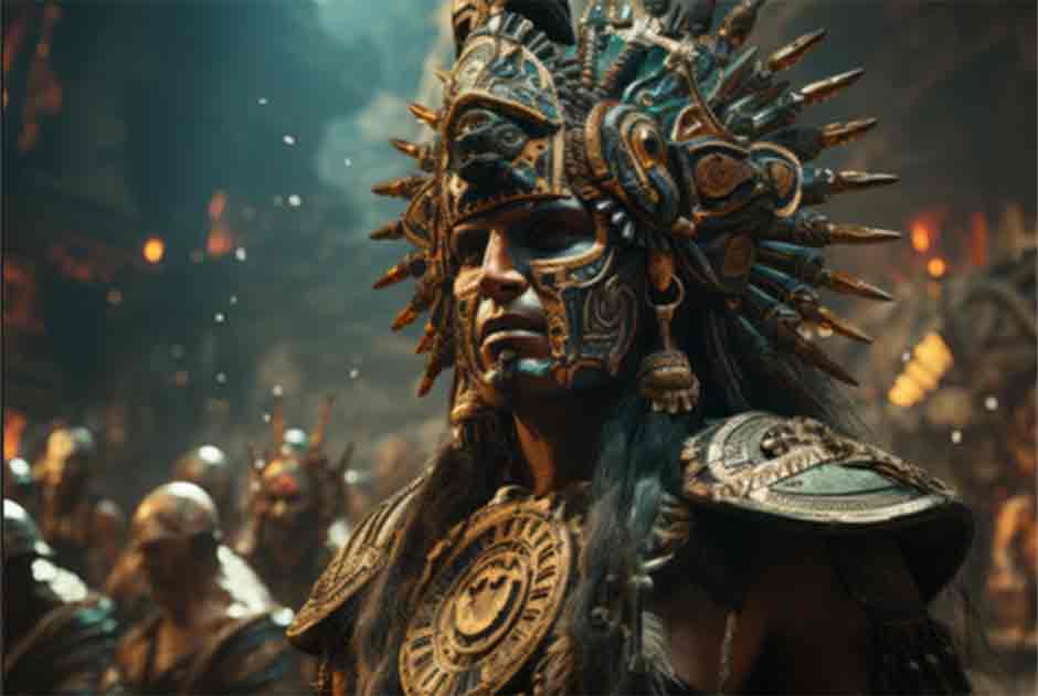 Top image: Photo of an Aztec warrior in imagined armor. Source: Superhero Woozie/Adobe Stock