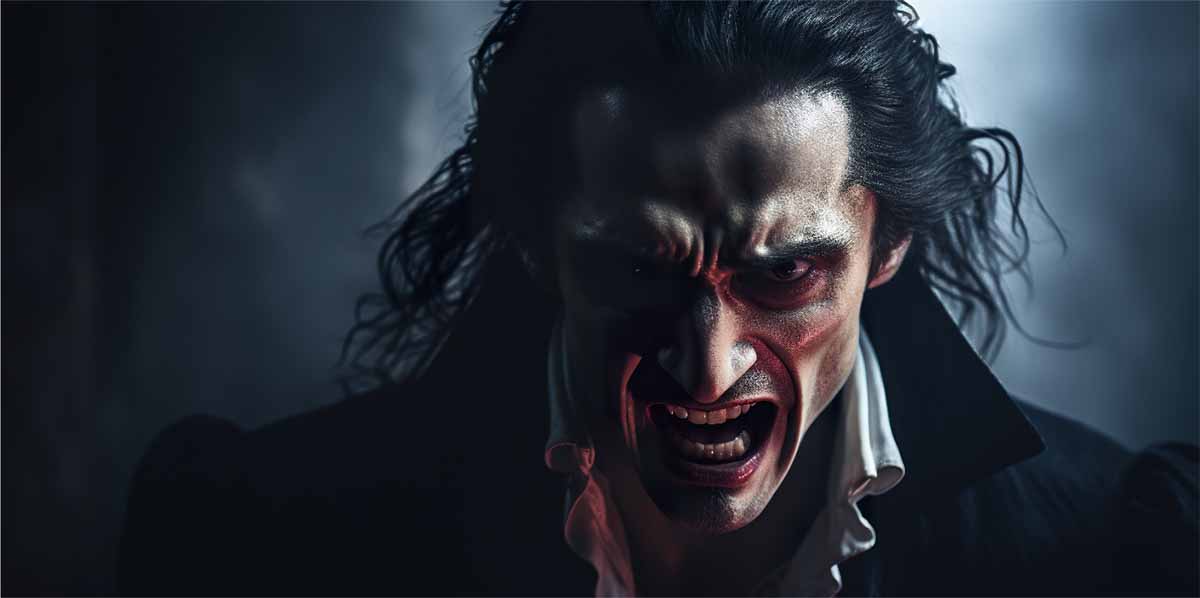 Top image: AI close-up portrait of Dracula baring his sharp fangs, with a predatory glare in a dark room. Source: EOL STUDIOS