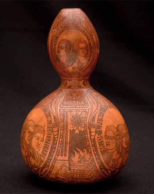 A hollowed-out gourd had been in the family for over a century inscribed with the following phrase: “On January 21, Maximilien Bourdaloue dipped his handkerchief in the blood of Louis XVI after his decapitation.” Decorated with etched portraits of heroes from the French Revolution, it appeared to have been stuffed with one of the blood-soaked handkerchiefs.