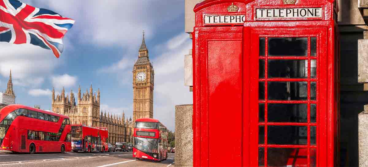 Top image: London symbols of British culture with Big Ben, a double-decker bus and Red Phone Booths. Source: Tomas Marek/ Adobe Stock