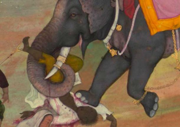 Under the control of a mahout, elephants could inflict a slow and torturous death by crushing the convicted person’s limbs one by one and tossing them about the ground, dragging them, or stabbing them with their tusks, before finishing them off by crushing their skull.