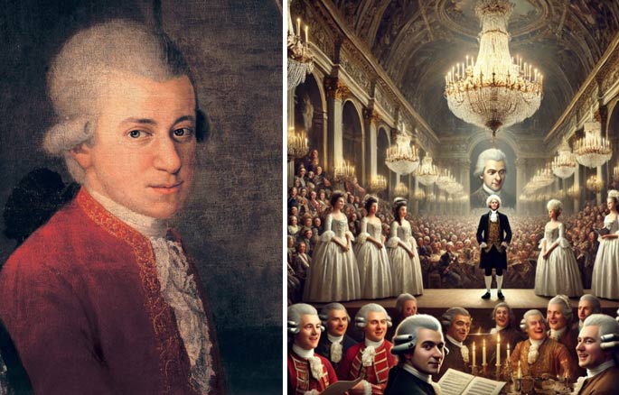 Top image: Left; Detail of Wolfgang Amadeus Mozart from Mozart family portrait by Croce. Right; and AI representation of the scene in Vienna. Source: Public Domain